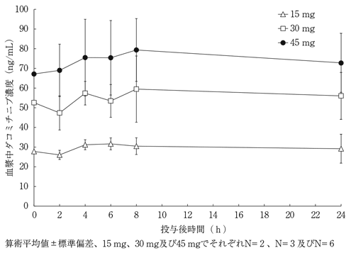 日本人進行固形癌患者計13例に本剤15、30注)及び45mgを単回投与したとき、投与後6~24時間(中央値)でCmaxに達した。本剤の消失半減期は61~98時間(算術平均値)であり、Cmax及びAUCは概ね用量に比例して増加した4) 。