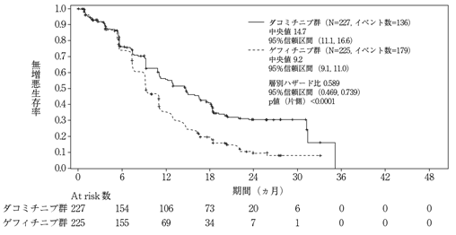 化学療法歴のないEGFR遺伝子の活性型変異注1)陽性注2)の切除不能な進行・再発の非小細胞肺癌注3)患者を対象に、本剤の有効性及び安全性をゲフィチニブと比較することを目的とした非盲検無作為化国際共同第Ⅲ相試験が実施された。452例(日本人81例)を本剤群227例(日本人40例)及びゲフィチニブ群225例(日本人41例)に無作為に割り付け、本剤45mg又はゲフィチニブ250mgを1日1回経口投与した。主要評価項目である独立画像中央判定委員会評価による無増悪生存期間の中央値は、本剤群で14.7ヵ月(95%信頼区間:11.1, 16.6)、ゲフィチニブ群で9.2ヵ月(95%信頼区間:9.1, 11.0)であり、ゲフィチニブ群に比べて本剤群で統計的に有意な無増悪生存期間の延長が認められた(ハザード比[95%信頼区間]:0.589[0.469, 0.739]、p値<0.0001:層別ログランク検定)(2016年7月29日データカットオフ)17)。