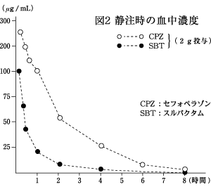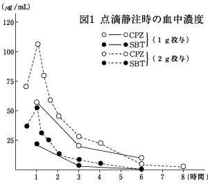 成人患者5例に1g(力価)また健常成人4名に2g(力価)を1時間かけて点滴静注したときのセフォペラゾン、スルバクタムの平均血中濃度の推移は図1のとおりであり、健常成人5名に2g(力価)を5分間かけて静注したときは図2のとおりであった4),5),6)。また2g(力価)を1日2回、3日間連続投与したが、ほぼ同じ血中濃度の推移が得られ、蓄積は認められなかった7)。