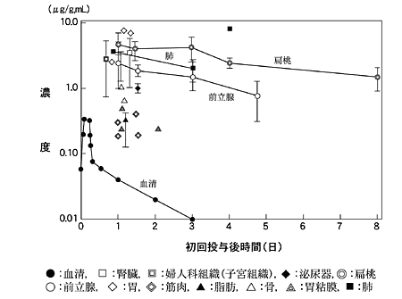 手術予定患者にアジスロマイシン経口剤500mg(力価)を経口投与した際の投与後12時間~8日目の各種組織内濃度の検討では、いずれの組織においても、血清中濃度が消失後も数日にわたって高い組織内濃度が維持された22)(外国人データ)。なお、アジスロマイシンのヒトにおける全身クリアランス及び分布容積はそれぞれ10mL/min/kg及び33.3L/kgと報告されており、分布容積が大きく、組織へ移行しやすいことが示されている23)。