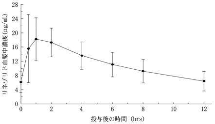 リネゾリドを単回又は反復経口投与又は点滴静注した後の平均薬物動態パラメータを、表1に要約する。リネゾリド600mgの錠剤を12時間ごとに反復経口投与したときのリネゾリドの平均最低血漿中濃度(Cmin)は6.15μg/mL、平均最高血漿中濃度(Cmax)は21.2μg/mLであり、反復経口投与後の血漿中濃度は適応菌種におけるMIC90(≦4μg/mL)を上回った。リネゾリド600mgを1日2回12時間ごとに反復経口投与した後の血漿中濃度の推移を図1に示す2),3),4)(外国人及び日本人データ)。