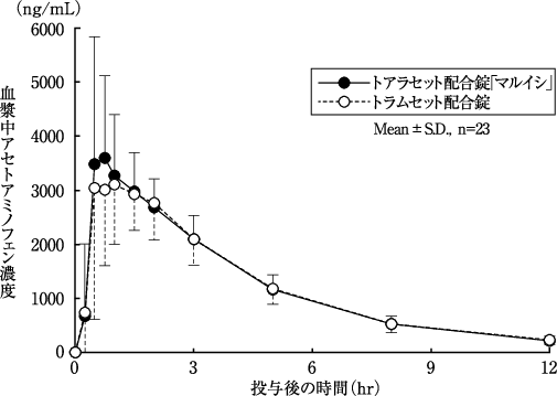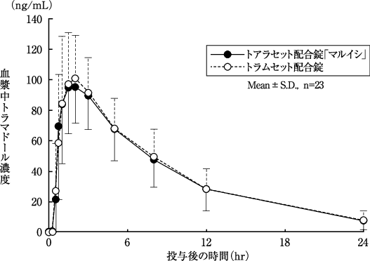 トアラセット配合錠「マルイシ」とトラムセット配合錠をクロスオーバー法によりそれぞれ1錠(トラマドール塩酸塩として37.5mg及びアセトアミノフェンとして325mg)健康成人男子(n=23)に絶食単回経口投与してトラマドール及びアセトアミノフェンの血漿中濃度を測定し、得られた薬物動態パラメータ(AUC、Cmax)について90%信頼区間法にて統計解析を行った。その結果、いずれもlog(0.80)~log(1.25)の範囲内であり、両剤の生物学的同等性が確認された2)。