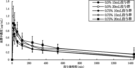 レボブピバカイン0.5% 15mL(75mg)、0.5% 20mL(100mg)、0.75% 10mL(75mg)、0.75% 15mL(112.5mg)及び0.75% 20mL(150mg)を下腹部あるいは下肢手術を受ける患者に硬膜外腔注1)へ投与した時、血漿中未変化体濃度は約0.3~0.5時間後に最高に達し、約9~16時間の半減期で消失した(図1及び表1)1),2)。