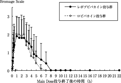 硬膜外麻酔による下腹部あるいは下肢手術患者を対象にレボブピバカイン0.75% 20mL(150mg)の痛覚神経遮断効果についてロピバカイン0.75% 20mL(150mg)を対照薬として用いた二重盲検比較試験(穿刺部位:L3-4)を実施した。その結果、主要評価項目であるPPSにおける第10胸椎(Th10)の痛覚神経遮断の作用持続時間については、本剤群が389.1±84.6分、ロピバカイン群が315.0±108.1分であり、本剤群のロピバカイン群に対する非劣性が検証された(片側p<0.001、△上乗せによる2標本t検定、△=60分)。両群間の差とその95%信頼区間は74.1分[16.0, 132.1]であった。また、痛覚神経遮断の推移(無痛域の広がり)は、両投与群とも投与後30分までは経時的に広がり、投与後3時間以降で狭くなる推移を示した。運動神経遮断の推移は、有意差は認められなかったものの、レボブピバカイン投与群で遮断作用が強い(遮断時間が長い)傾向が認められた。痛覚神経遮断の推移及び運動神経遮断の程度の推移を図1及び図2に示した。副作用発現頻度は、レボブピバカイン群で73.3%(22/30例)であった。主な副作用は、血圧低下63.3%(19/30例)、嘔吐10.0%(3/30例)及び徐脈6.7%(2/30例)であった7),8)。