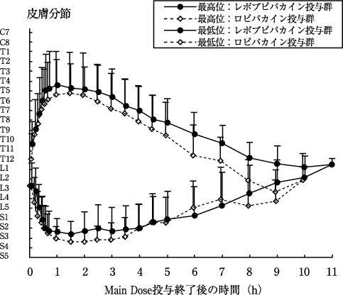 硬膜外麻酔による下腹部あるいは下肢手術患者を対象にレボブピバカイン0.75% 20mL(150mg)の痛覚神経遮断効果についてロピバカイン0.75% 20mL(150mg)を対照薬として用いた二重盲検比較試験(穿刺部位:L3-4)を実施した。その結果、主要評価項目であるPPSにおける第10胸椎(Th10)の痛覚神経遮断の作用持続時間については、本剤群が389.1±84.6分、ロピバカイン群が315.0±108.1分であり、本剤群のロピバカイン群に対する非劣性が検証された(片側p<0.001、△上乗せによる2標本t検定、△=60分)。両群間の差とその95%信頼区間は74.1分[16.0, 132.1]であった。また、痛覚神経遮断の推移(無痛域の広がり)は、両投与群とも投与後30分までは経時的に広がり、投与後3時間以降で狭くなる推移を示した。運動神経遮断の推移は、有意差は認められなかったものの、レボブピバカイン投与群で遮断作用が強い(遮断時間が長い)傾向が認められた。痛覚神経遮断の推移及び運動神経遮断の程度の推移を図1及び図2に示した。副作用発現頻度は、レボブピバカイン群で73.3%(22/30例)であった。主な副作用は、血圧低下63.3%(19/30例)、嘔吐10.0%(3/30例)及び徐脈6.7%(2/30例)であった7),8)。