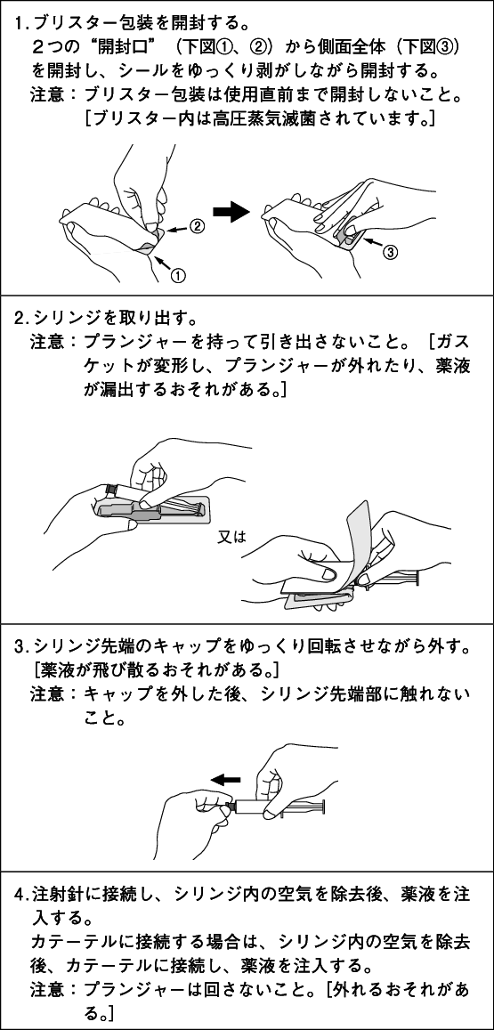 シリンジの再滅菌・再使用はしないこと。開封後の使用は1回限りとし、使用後の残液はシリンジとともに速やかに廃棄すること。