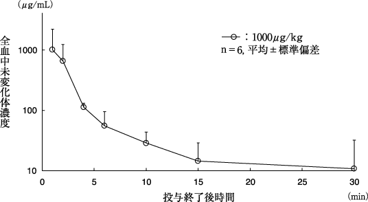 健康成人6例にエスモロール塩酸塩を1000μg/kgの用量で30秒間かけて単回静脈内投与したとき、全血中未変化体は3.6分の半減期で消失し、AUCは3.8μg・min/mL、クリアランスは243mL/min/kg、分布容積は1320mL/kgであった(表1)。代謝物であるASL-8123は投与後100分で最高全血中濃度を示し、約3.5時間の半減期で消失した1)。