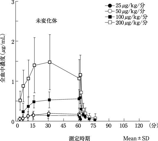 健康成人にエスモロール塩酸塩を25、50、100及び200μg/kg/分で1時間持続静脈内投与したとき(各用量6例)、全血中未変化体濃度(平均±標準偏差)は、それぞれ0.14±0.06、0.17±0.14、0.56±0.23及び1.07±0.47μg/mLであった4)。