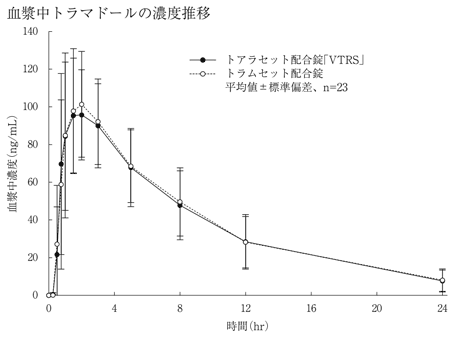 トアラセット配合錠「VTRS」とトラムセット配合錠を、クロスオーバー法によりそれぞれ1錠(トラマドール塩酸塩として37.5mg、アセトアミノフェンとして325mg)健康成人男子に絶食時単回経口投与して血漿中トラマドール塩酸塩濃度及び血漿中アセトアミノフェン濃度を測定し、得られた薬物動態パラメータ(AUC、Cmax)について90%信頼区間法にて統計解析を行った結果、log(0.80)~log(1.25)の範囲内であり、両剤の生物学的同等性が確認された2)。