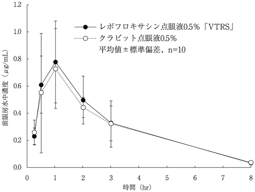 レボフロキサシン点眼液0.5%「VTRS」又はクラビット点眼液0.5%をウサギに点眼し、各測定時点における前眼房水及び角膜中レボフロキサシン濃度を測定した。両製剤間の前眼房水及び角膜中レボフロキサシン濃度に有意差は認められず、生物学的同等性が確認された5)。