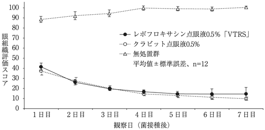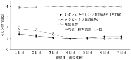 レボフロキサシン点眼液0.5%「VTRS」及びクラビット点眼液0.5%におけるウサギ緑膿菌性角膜感染モデルに対する治癒効果を比較検討した。その結果、両製剤ともに優れた治癒効果を示し、また両製剤間の治癒効果に有意差は認められず、生物学的同等性が確認された19)。