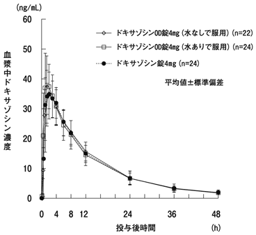 ドキサゾシンOD錠4mgは、水なしで服用又は水とともに服用した場合のいずれにおいても、ドキサゾシン錠4mgと生物学的に同等であることが確認された。また、OD錠4mgはOD錠0.5mg、OD錠1mg及びOD錠2mgと溶出挙動が同等であり、生物学的に同等とみなされた6),7),8)。