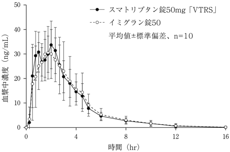 スマトリプタン錠50mg「VTRS」とイミグラン錠50を、クロスオーバー法によりそれぞれ1錠(スマトリプタンとして50mg)健康成人男子10名に絶食単回経口投与して血漿中スマトリプタン濃度を測定し、得られた薬物動態パラメータ(AUC、Cmax)について90%信頼区間法にて統計解析を行った結果、log(0.80)~log(1.25)の範囲内であり、両剤の生物学的同等性が確認された6)。