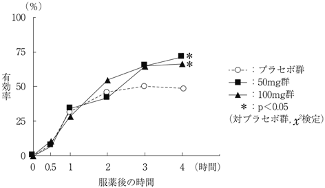 片頭痛患者を対象としたプラセボ対照、用量反応、二重盲検比較試験において、スマトリプタン錠50mg、100mgの服薬4時間後における有効率はそれぞれ71.4%(50/70例)及び66.7%(46/69例)であり、プラセボと比較し、2時間から3時間後より差がみられ、服薬4時間後において有意に高い有効率を示した16)。