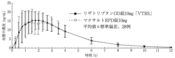 リザトリプタンOD錠10mg「VTRS」とマクサルトRPD錠10mgを、クロスオーバー法によりそれぞれ1錠(リザトリプタンとして10mg)健康成人男子に絶食時単回経口投与(水で服用及び水なしで服用)して血漿中リザトリプタン濃度を測定し、得られた薬物動態パラメータ(AUC、Cmax)について90%信頼区間法にて統計解析を行った結果、log(0.80)~log(1.25)の範囲内であり、両剤の生物学的同等性が確認された6)。