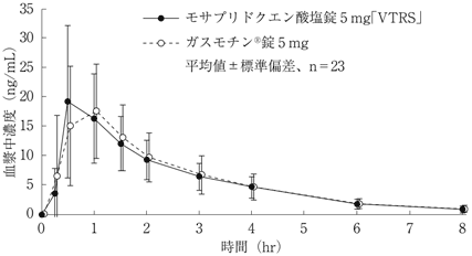健康成人男子にモサプリドクエン酸塩錠5mg「VTRS」とガスモチン®錠のそれぞれ1錠(モサプリドクエン酸塩として5mg)を、絶食時単回経口投与して血漿中モサプリドクエン酸塩濃度を測定し、得られた薬物動態パラメータ(AUC、Cmax)について90%信頼区間法にて統計解析を行った結果、log(0.80)~log(1.25)の範囲内であり、両剤の生物学的同等性が確認された(クロスオーバー法)3)。