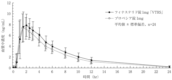 フィナステリド錠1mg「VTRS」とプロペシア錠1mgを、クロスオーバー法によりそれぞれ1錠(フィナステリドとして1mg)健康成人男子に絶食時単回経口投与して血漿中フィナステリド濃度を測定し、得られた薬物動態パラメータ(AUC、Cmax)について90%信頼区間法にて統計解析を行った結果、log(0.80)~log(1.25)の範囲内であり、両剤の生物学的同等性が確認された10)。