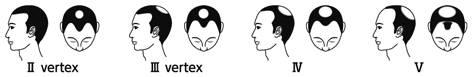 24歳から50歳の男性型脱毛症患者(Modified Norwood-Hamilton分類25)Ⅱvertex、Ⅲvertex、Ⅳ及びⅤ:図1)414例を対象とした48週間のプラセボ対照二重盲検比較試験において、頭頂部毛髪の変化を写真により7段階で評価した結果、フィナステリド錠投与群(0.2mg/日及び1mg/日)はプラセボ群と比較して統計的に有意な改善を示したが、実薬群間では統計的な有意差は認められなかった。投与前と比べ48週で改善と判定されたのは、0.2mg投与群で54.2%(71/131例)、1mg投与群で58.3%(77/132例)、プラセボ群で5.9%(8/135例)であった。副作用(臨床検査値異常変動を含む)の発現割合は0.2mg投与群で1.5%(2/137例)、1mg投与群で6.5%(9/139例)、プラセボ群で2.2%(3/138例)であった。性機能に関する副作用は0.2mg投与群で1.5%(2/137例)、1mg投与群で2.9%(4/139例)、プラセボ群で2.2%(3/138例)に認められた26),27)。フィナステリド錠投与群(0.2mg及び1mg)に認められた主な症状はリビドー減退1.1%(3/276例)、勃起機能不全0.7%(2/276例)であった27)。