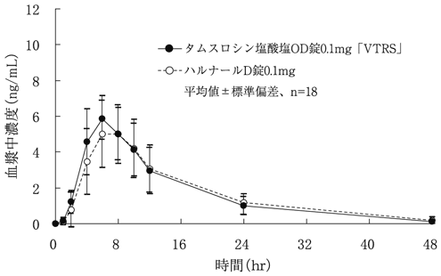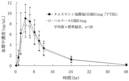タムスロシン塩酸塩OD錠0.1mg「VTRS」とハルナールD錠0.1mgを、クロスオーバー法によりそれぞれ2錠(タムスロシン塩酸塩として0.2mg)健康成人男子に単回経口投与(絶食時-水で服用、絶食時-水なしで服用及び食後-水なしで服用)して血漿中タムスロシン濃度を測定し、得られた薬物動態パラメータ(AUC、Cmax)について90%信頼区間法にて統計解析を行った結果、log(0.80)~log(1.25)の範囲内であり、両剤の生物学的同等性が確認された6)。