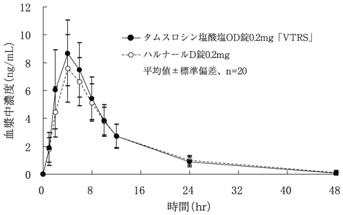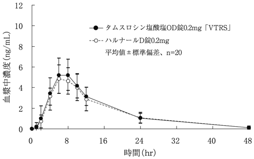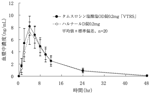 タムスロシン塩酸塩OD錠0.2mg「VTRS」とハルナールD錠0.2mgを、クロスオーバー法によりそれぞれ1錠(タムスロシン塩酸塩として0.2mg)健康成人男子に単回経口投与(絶食時-水で服用、絶食時-水なしで服用及び食後-水なしで服用)して血漿中タムスロシン濃度を測定し、得られた薬物動態パラメータ(AUC、Cmax)について90%信頼区間法にて統計解析を行った結果、log(0.80)~log(1.25)の範囲内であり、両剤の生物学的同等性が確認された7)。