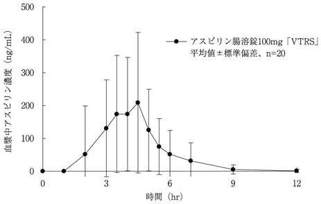 アスピリン腸溶錠100mg「VTRS」を健康成人男子に1錠(アスピリンとして100mg)絶食時単回経口投与したときの薬物動態は以下のとおりであった6)。(「経口固形製剤の処方変更の生物学的同等性試験ガイドライン」に従い、ヒトを対象とした生物学的同等性試験によりバイアスピリン錠100mgとの同等性が確認された旧処方製剤と、現処方製剤について実施した生物学的同等性試験におけるデータ)
