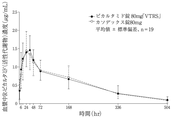 ビカルタミド錠80mg「VTRS」とカソデックス錠80mgを、クロスオーバー法によりそれぞれ1錠(ビカルタミド80mg)健康成人男子に絶食単回経口投与して血漿中R-ビカルタミド(活性代謝物)濃度を測定し、得られた薬物動態パラメータ(AUC、Cmax)について90%信頼区間法にて統計解析を行った結果、log(0.80)~log(1.25)の範囲内であり、両剤の生物学的同等性が確認された3)。