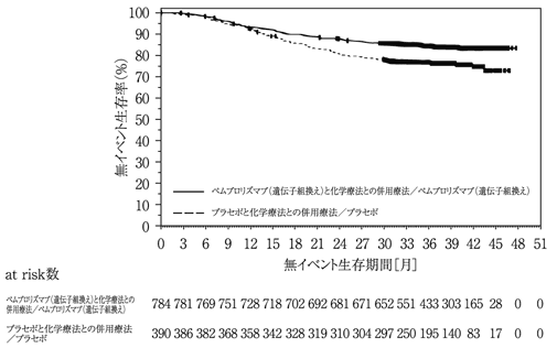 ホルモン受容体陰性かつHER2陰性で再発高リスク注1)の周術期の乳癌患者1,174例(日本人76例を含む)を対象に、術前薬物療法としてのペムブロリズマブ(遺伝子組換え)と化学療法との併用療法、及び術後薬物療法としてのペムブロリズマブ(遺伝子組換え)単独療法注2)の有効性及び安全性が、術前薬物療法としてのプラセボと化学療法との併用療法、及び術後薬物療法としてのプラセボ投与注3)を対照とした二重盲検試験で検討された。主要評価項目の一つは無イベント生存期間(EFS)とされ、術前のペムブロリズマブ(遺伝子組換え)と化学療法との併用療法及び術後のペムブロリズマブ(遺伝子組換え)単独投与は、術前のプラセボと化学療法との併用療法及び術後のプラセボ投与と比較してEFSを有意に延長した(表及び図)。安全性解析対象例783例中769例(98.2%)(日本人45例中45例を含む)に副作用が認められた。主な副作用(20%以上)は、脱毛症451例(57.6%)、悪心391例(49.9%)、貧血339例(43.3%)、好中球減少症324例(41.4%)、疲労272例(34.7%)、下痢193例(24.6%)、ALT増加182例(23.2%)、発疹164例(20.9%)、無力症162例(20.7%)、便秘160例(20.4%)であった。