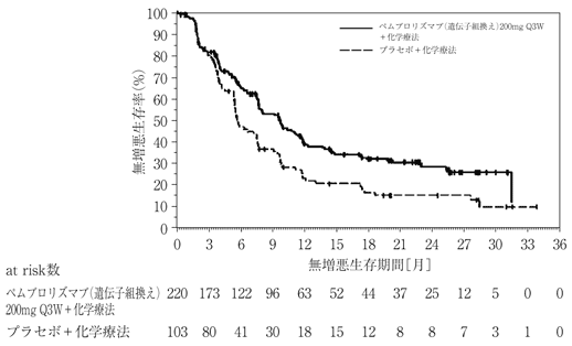 転移・再発乳癌に対する全身性の前治療歴のない転移・再発又は局所進行性のホルモン受容体陰性かつHER2陰性の乳癌患者847例(日本人87例を含む)を対象に、ペムブロリズマブ(遺伝子組換え)200mg 3週間間隔投与+化学療法(ゲムシタビン及びカルボプラチン、パクリタキセル又はnab-パクリタキセル)の併用療法の有効性及び安全性が、プラセボ+化学療法(ゲムシタビン及びカルボプラチン、パクリタキセル又はnab-パクリタキセル)の併用療法を対照とした二重盲検試験で検討された。両群とも、ゲムシタビン及びカルボプラチン、パクリタキセル又はnab-パクリタキセルは、担当医師が患者ごとに選択した。なお、画像評価で疾患進行が認められた場合に、疾患進行を示す症状が認められない等の臨床的に安定している患者では、次回以降の画像評価で疾患進行が認められるまでペムブロリズマブ(遺伝子組換え)の投与を継続することが可能とされた。主要評価項目は無増悪生存期間(PFS)及び全生存期間(OS)とされ、ペムブロリズマブ(遺伝子組換え)+化学療法の併用療法はプラセボ+化学療法の併用療法と比較して、PD-L1陽性(CPS注4)≧10)の患者323例(日本人28例を含む)においてPFSを有意に延長した(表及び図)21)。PD-L1陽性(CPS≧10)のペムブロリズマブ(遺伝子組換え)+ゲムシタビン及びカルボプラチンが併用投与された患者における安全性解析対象例125例中122例(97.6%)(日本人14例中14例を含む)に副作用が認められた。主な副作用(20%以上)は、貧血75例(60.0%)、悪心64例(51.2%)、好中球減少症63例(50.4%)、好中球数減少44例(35.2%)、疲労42例(33.6%)、血小板数減少41例(32.8%)、血小板減少症40例(32.0%)、白血球減少症35例(28.0%)、ALT増加35例(28.0%)、嘔吐30例(24.0%)、白血球数減少30例(24.0%)及びAST増加27例(21.6%)であった。注4)PD-L1を発現した細胞数(腫瘍細胞、マクロファージ及びリンパ球)を総腫瘍細胞数で除し、100を乗じた値