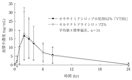 オキサトミドシロップ小児用0.2%「VTRS」30mLとセルテクトドライシロップ2% 3.0g(それぞれオキサトミドとして60mg)をクロスオーバー法により健康成人男子に絶食時単回経口投与して血漿中オキサトミド濃度を測定し、得られた薬物動態パラメータ(AUC、Cmax)の平均値の差はセルテクトドライシロップ2%の20%以内であり、両剤の生物学的同等性が確認された2)。