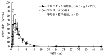 オロパタジン塩酸塩OD錠5mg「VTRS」とアレロックOD錠5を、クロスオーバー法によりそれぞれ1錠(オロパタジン塩酸塩として5mg)健康成人男子に絶食時単回経口投与(水で服用及び水なしで服用)して血漿中オロパタジン塩酸塩濃度を測定し、得られた薬物動態パラメータ(AUC、Cmax)について90%信頼区間法にて統計解析を行った結果、log(0.80)~log(1.25)の範囲内であり、両剤の生物学的同等性が確認された3)。