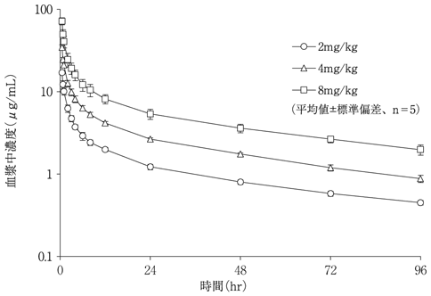 健康成人男子各群5例に2、4及び8mg/kgのテイコプラニンを30分かけて点滴静注したときの最高血漿中濃度はそれぞれ17.0、34.4及び71.8μg/mLを示し、投与後初期に比較的速やかに減少した後、終末半減期46~56時間ときわめて穏やかに消失した1)。