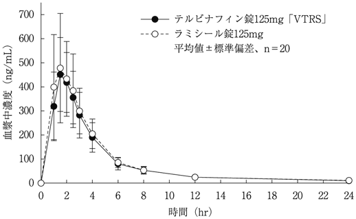 テルビナフィン錠125mg「VTRS」とラミシール錠125mgを、クロスオーバー法によりそれぞれ1錠(テルビナフィンとして125mg)健康成人男子に絶食時単回経口投与して血漿中テルビナフィン塩酸塩濃度を測定し、得られた薬物動態パラメータ(AUC、Cmax)について90%信頼区間法にて統計解析を行った結果、log(0.80)~log(1.25)の範囲内であり、両剤の生物学的同等性が確認された3)。
