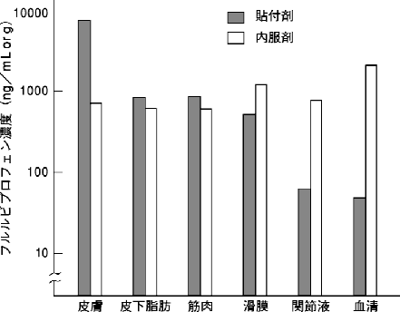 変形性膝関節症等の患者に1枚中フルルビプロフェン40mg含有貼付剤を適用した場合の薬物の組織移行性を、同量のフルルビプロフェン(40mg)経口投与時と比較した結果、滑膜中濃度はやや低いが、皮下脂肪、筋肉内濃度はほぼ近似した傾向が認められた4)。
