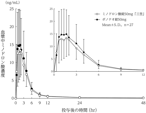 ミノドロン酸錠50mg「三笠」とボノテオ錠50mgを、クロスオーバー法によりそれぞれ1錠(ミノドロン酸水和物として50mg)健康閉経後女性に絶食単回経口投与して血漿中未変化体濃度を測定し、得られた薬物動態パラメータ(AUC、Cmax)について90%信頼区間法にて統計解析を行った結果、log(0.80)~log(1.25)の範囲内であり、両剤の生物学的同等性が確認された4)。