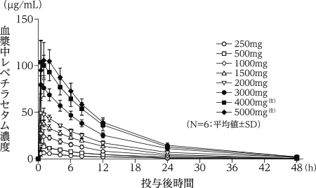 健康成人にレベチラセタム250、500、1000、1500、2000、3000、4000注1)、5000mg注1)(各投与量6例)を空腹時に単回経口投与したとき、すべての投与量でレベチラセタムの血漿中濃度は投与後ほぼ1時間に最高値を示し、消失半減期(t1/2)は投与量にかかわらず7~9時間であった3)。