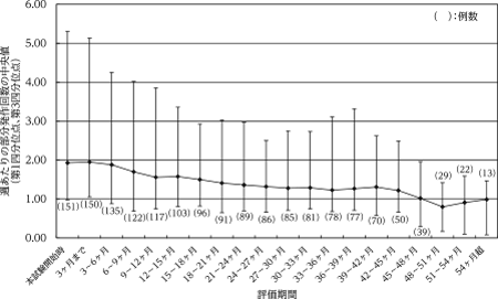 国内第Ⅱ/Ⅲ相試験(成人、併用療法)を完了した患者151例を対象として、レベチラセタム1000~3000mg/日を1日2回に分けて経口投与したときの部分発作回数は以下のとおりであった23),24)。本試験に参加した被験者のうち、76例がその後計画された継続試験に移行し本試験を終了した(24~36ヵ月で1例、36~48ヵ月で47例、48ヵ月以降で28例)。