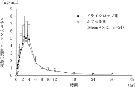 通常、1歳以上の患者には、スチリペントールとして1日50mg/kgを1日2~3回に分割して食事中又は食直後に経口投与する。投与は1日20mg/kgから開始し、1週間以上の間隔をあけ10mg/kgずつ増量する。ただし、体重50kg以上の患者には、スチリペントールとして1日1000mgから投与を開始し、1週間以上の間隔をあけ500mgずつ増量する。なお、1日最大投与量は50mg/kg又は2500mgのいずれか低い方を超えないこととする。