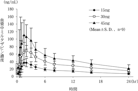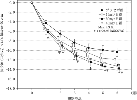 うつ病患者を対象とした6週間の無作為化二重盲検比較試験を実施した。すべての本剤投与群で初期用量は15mg/日とし、30mg/日群及び45mg/日群は2週目に30mgへ強制増量、45mg/日群は3週目に45mgへ強制増量し、各群共に増量後は用量を維持した。本剤15mg/日群及び30mg/日群の、投与終了(中止)時のHAM-D合計スコア(17項目)の投与開始前からの変化量(LOCF)はプラセボ群に比較して有意に大きかった。なお、本剤45mg/日群での効果は、30mg/日群を上回るものではなかった17)。
