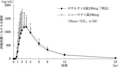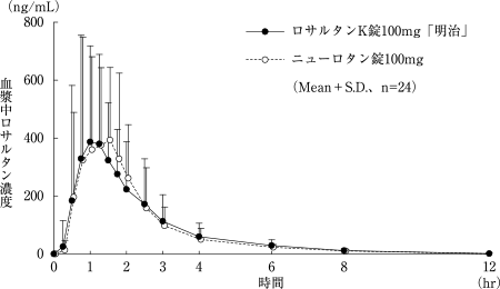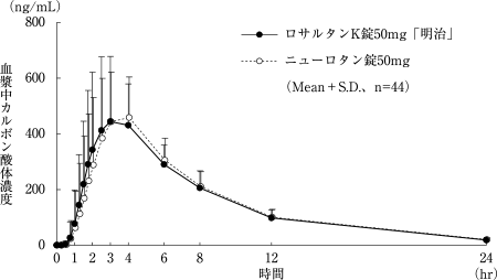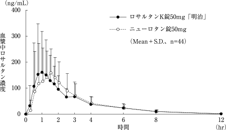ロサルタンK錠50mg「明治」とニューロタン錠50mg又はロサルタンK錠100mg「明治」とニューロタン錠100mgを、クロスオーバー法によりそれぞれ1錠(ロサルタンカリウムとして50mg又は100mg)健康成人男子に絶食単回経口投与して血漿中未変化体濃度を測定し、得られた薬物動態パラメータ(AUC、Cmax)について90%信頼区間法にて統計解析を行った結果、AUCはlog(0.80)~log(1.25)の範囲内であり、またCmaxの対数値の平均値の差はlog(0.90)~log(1.11)の範囲内であり、かつ溶出試験における溶出挙動に類似性が認められたことから、両剤の生物学的同等性が確認された。また、ロサルタンの活性代謝物であるカルボン酸体の血漿中濃度を測定し、薬物動態を確認したところ、両剤で同様な結果が得られた7),8)。