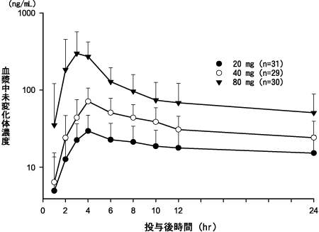 日本人及び外国人の臨床試験における薬物動態を検討した結果、Cmax及びAUCに個体差が認められ、80mg以上の投与量においてその傾向が顕著であった11)。