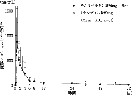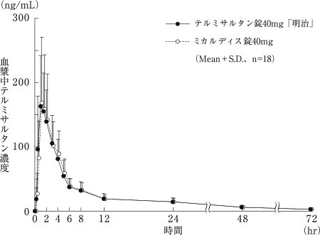 テルミサルタン錠40mg「明治」とミカルディス錠40mg又はテルミサルタン錠80mg「明治」とミカルディス錠80mgを、クロスオーバー法によりそれぞれ1錠(テルミサルタンとして40mg又は80mg)健康成人男子に絶食単回経口投与して血漿中テルミサルタン濃度を測定し、得られた薬物動態パラメータ(AUC、Cmax)について90%信頼区間法にて統計解析を行った結果、いずれもlog(0.80)~log(1.25)の範囲内であり、それぞれ両剤の生物学的同等性が確認された9),10)。