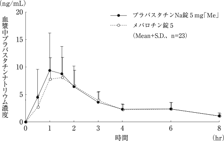 プラバスタチンNa錠5mg「Me」とメバロチン錠5又はプラバスタチンNa錠10mg「Me」とメバロチン錠10を、クロスオーバー法によりそれぞれ1錠(プラバスタチンナトリウムとして5mg又は10mg)健康成人男子に絶食単回経口投与して血漿中未変化体濃度を測定し、得られた薬物動態パラメータ(AUC、Cmax)について90%信頼区間法にて統計解析を行った結果、いずれもlog(0.8)~log(1.25)の範囲内であり、それぞれ両剤の生物学的同等性が確認された2),3)。