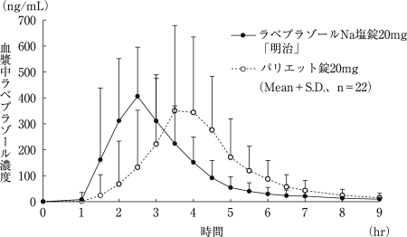 ラベプラゾールNa塩錠20mg「明治」とパリエット錠20mgを、クロスオーバー法によりそれぞれ1錠(ラベプラゾールナトリウムとして20mg)健康成人男子に絶食単回経口投与して血漿中未変化体濃度を測定し、得られた薬物動態パラメータ(AUC、Cmax)について90%信頼区間法にて統計解析を行った結果、log(0.8)〜log(1.25)の範囲内であり、両剤の生物学的同等性が確認された3)。