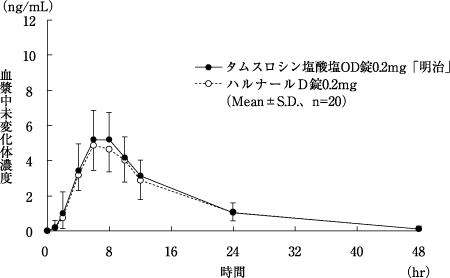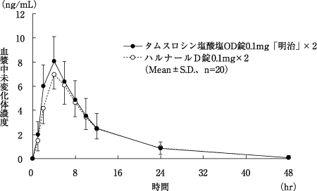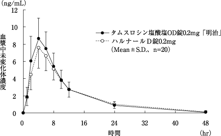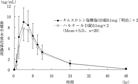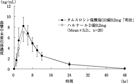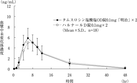 タムスロシン塩酸塩OD錠0.1mg「明治」とハルナールD錠0.1mg又はタムスロシン塩酸塩OD錠0.2mg「明治」とハルナールD錠0.2mgを、クロスオーバー法によりそれぞれ2錠又は1錠(タムスロシン塩酸塩として0.2mg)健康成人男子に絶食時水あり、絶食時水なし及び食後水なしの条件下、単回経口投与して血漿中未変化体濃度を測定し、得られた薬物動態パラメータ(AUC、Cmax)について90%信頼区間法にて統計解析を行った結果、いずれもlog(0.80)~log(1.25)の範囲内であり、それぞれ両剤の生物学的同等性が確認された3),4)。