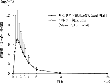 リセドロン酸Na錠17.5mg「明治」とベネット錠17.5mgを、クロスオーバー法によりそれぞれ1錠(リセドロン酸ナトリウムとして17.5mg)健康成人男子に絶食単回経口投与して血漿中リセドロン酸濃度を測定し、得られた薬物動態パラメータ(AUC、Cmax)について統計解析を行った結果、判定パラメータの対数値の平均値の差はlog(0.90)~log(1.11)の範囲内にあり、かつ溶出試験における溶出挙動に類似性が認められたことから、両剤の生物学的同等性が確認された6)。