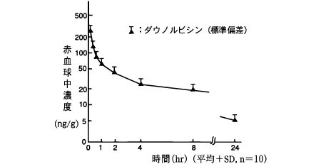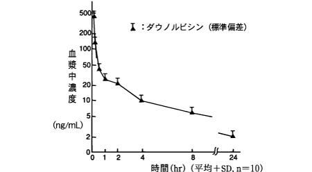 白血病成人患者10例に本剤40mgを投与したとき、24時間までの尿中総排泄率は、11.8±5.1%で、そのうちダウノルビシンは6.33±2.93%、ダウノルビシノールは5.30±2.48%であった4)。