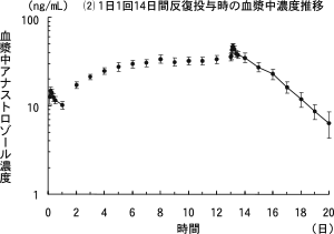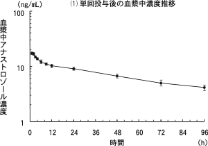 閉経後進行乳癌患者にアナストロゾール1日1回1mg及び10mgを反復投与したときの血漿中エストラジオール濃度は投与前値に対してそれぞれ約90%低下し、本薬の血漿中エストラジオール濃度低下作用は両用量でほぼ同程度であった9)。
