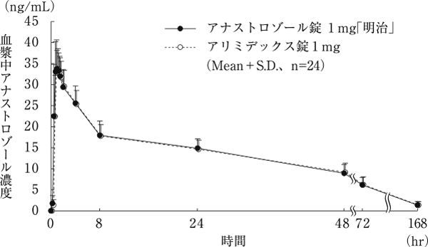 アナストロゾール錠1mg「明治」とアリミデックス錠1mgを、クロスオーバー法によりそれぞれ1錠(アナストロゾールとして1mg)閉経後の健康成人女性に絶食単回経口投与して血漿中未変化体濃度を測定し、得られた薬物動態パラメータ(AUC、Cmax)について90%信頼区間法にて統計解析を行った結果、log(0.8)~log(1.25)の範囲内であり、両剤の生物学的同等性が確認された2)。