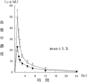 健康成人に単回点滴静注した時の血漿中濃度を図1に、薬物動態パラメータを表1に示す5)。