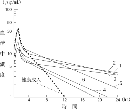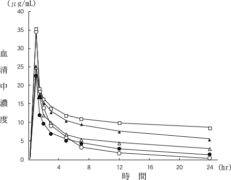点滴静注時の症例の内訳を表5に、血清中濃度を図4に、薬物動態パラメータを表6に示す12)。